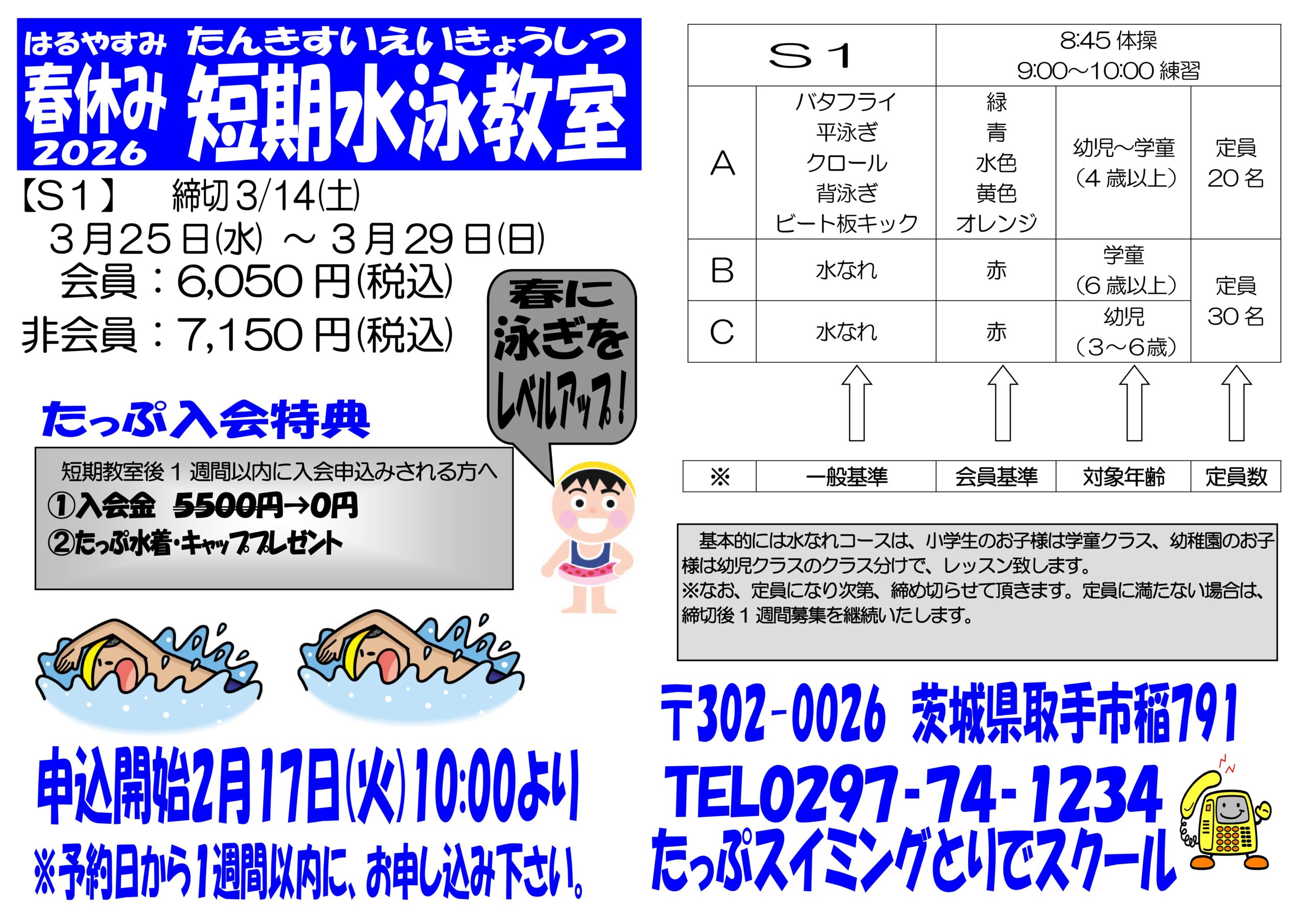 短期水泳教室受講後、たっぷとりでスイミングスクールに入会して頂くと、