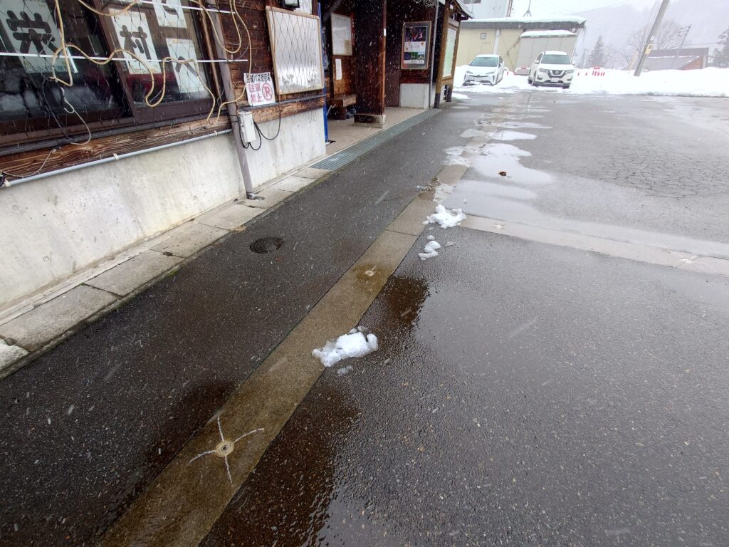 茨城では見ない道路から雪を解かす水が出ています。